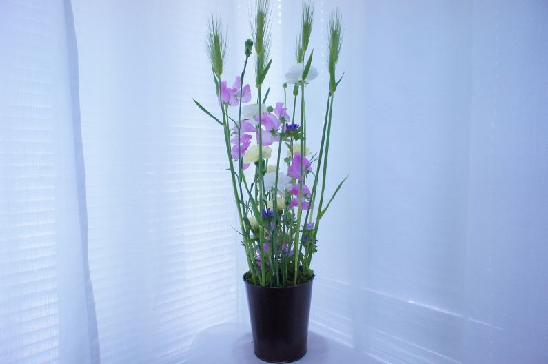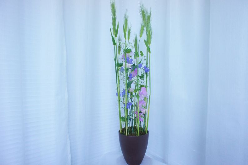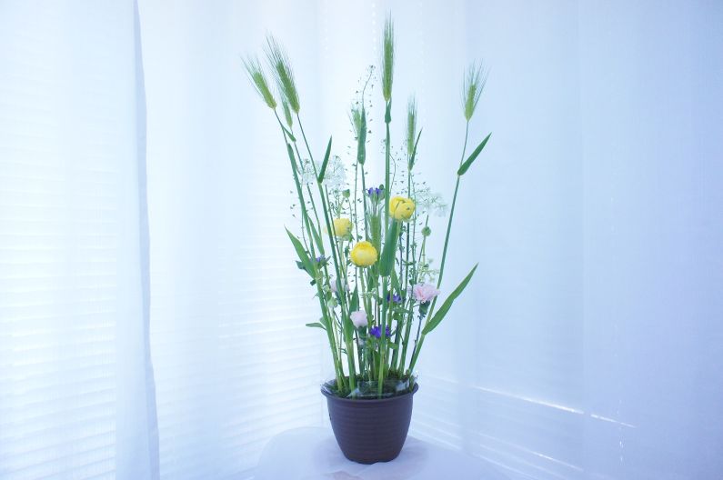 麦で作ったアウトラインの中に花をリズミカルに入れていきます。